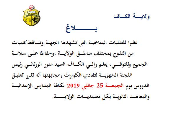 كما قرر والي الكاف و رئيس لجنة مجابهة الكوارث منور الورتاني في بلاغ تعليق الدروس يوم الجمعة 25 جانفي 2019 بكافة المدارس الابتدائية والمعاهد الثانوية بكل معتمديات الولاية وذلك نظرا للتقلبات المناخية التي تشهدها الجهة وتساقط كميات من الثلوج بمختلف مناطق الولاية وحفاظا على سلامة المواطنين.