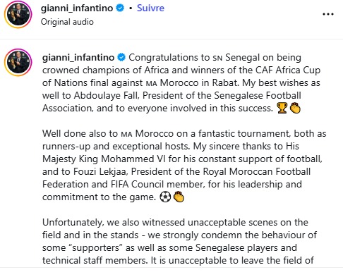وختم إنفانتينو رسالته قائلاً: أتوقع أن تتخذ الهيئات الانضباطية ذات الصلة في الاتحاد الأفريقي لكرة القدم الإجراءات المناسبة.