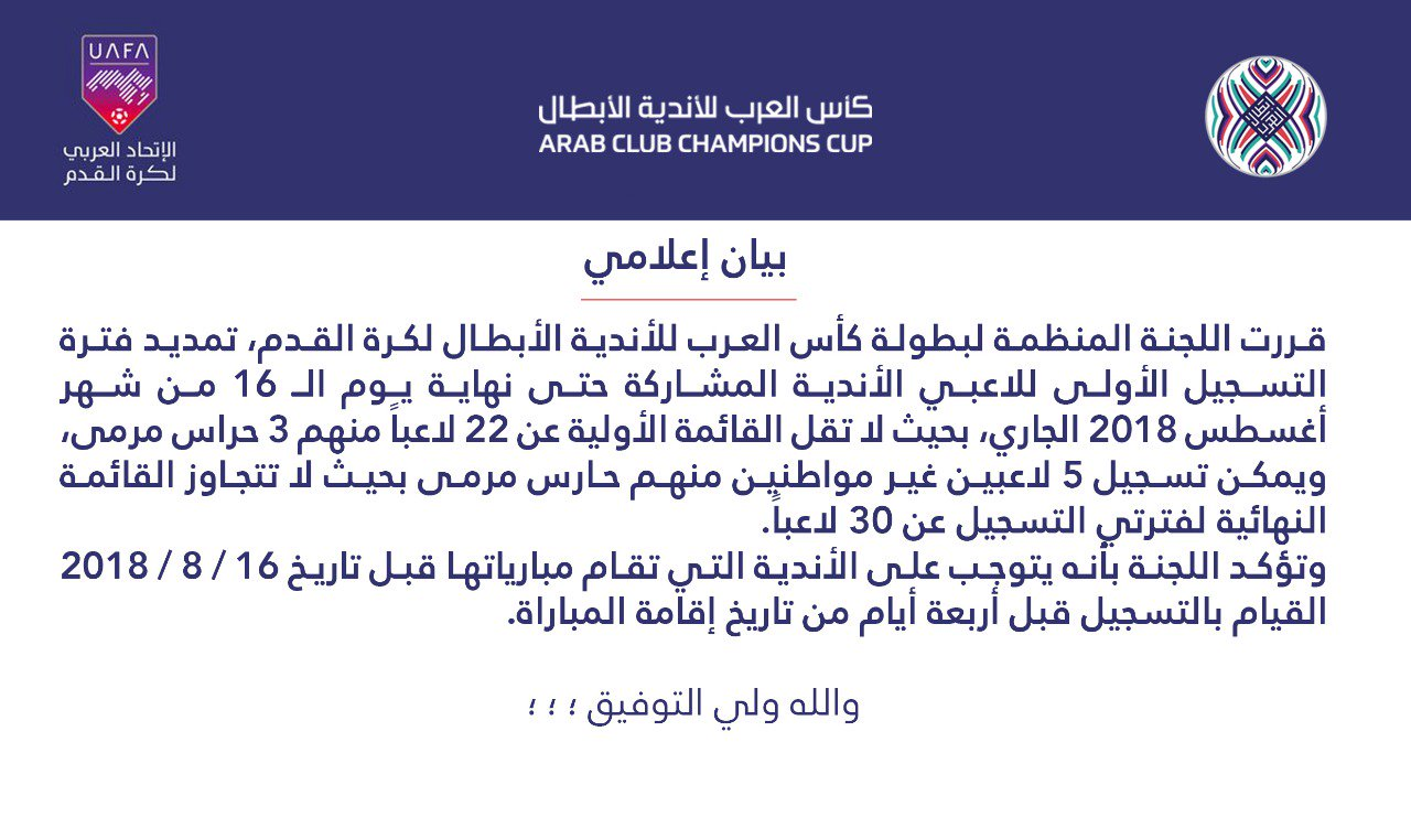 و من المنتظر ان يتيح الاتحاد العربي لكرة القدم المجال للفرق المشاركة لتسجيل 8 لاعبين اخرين في الميركاتو الشتوي ليصبح العدد النهائي للمسجلين 30 لاعبا .