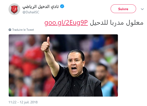 أعلن بطل دوري نجوم قطر مساء اليوم عبر موقعه الرسمي التعاقد مع نبيل معلول ليكون مدرب الفريق خلفا للجزائري جمال بلماضي الذي اعتذر عن مواصلة مشواره مع النادي لأسباب خاصة.