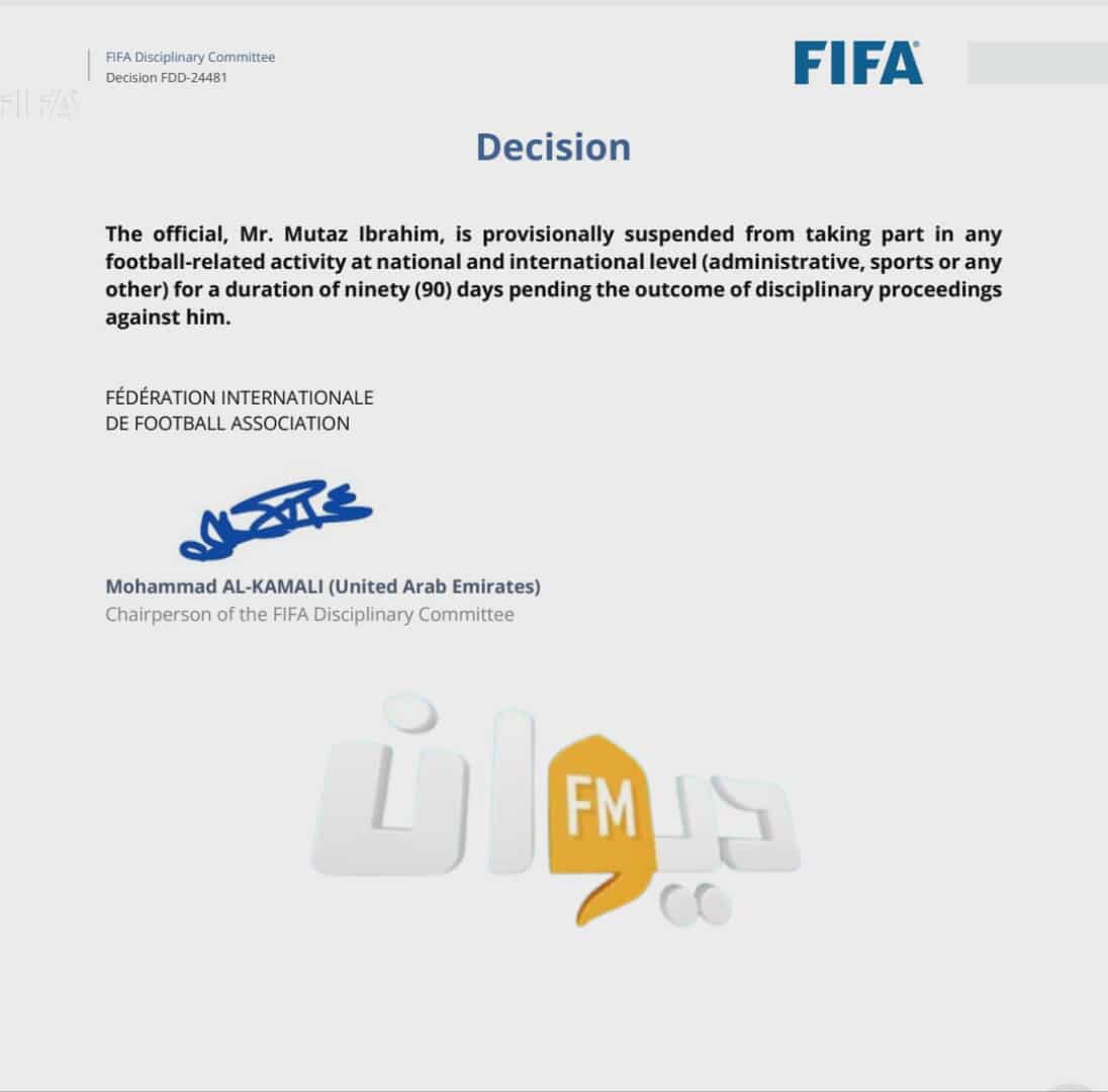 وأوقفت الفيفا الحكم الدولي الليبي في شهر سبتمبر نشاطه لمدة 90 يوماً قبل أن يقرر إستئناف هذا القرار الصادر عن الفيفا بحسب ما تبينه هذه الوثيقة الرسمية