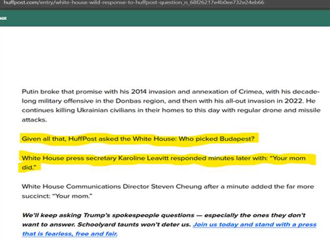 وكان مراسل الموقع وجه سؤالًا عبر أحد تطبيقات المحادثة للبيت الأبيض، متسائلًا عن سبب اختيار العاصمة المجرية بودابست لعقد القمة بين الرئيس الأمريكي دونالد ترامب ونظيره الروسي فلاديمير بوتين، وجاء الرد المفاجئ من "ليفيت" بعد دقائق: «أمك من فعلت»، بحسب ما ذكر الموقع الأمريكي.