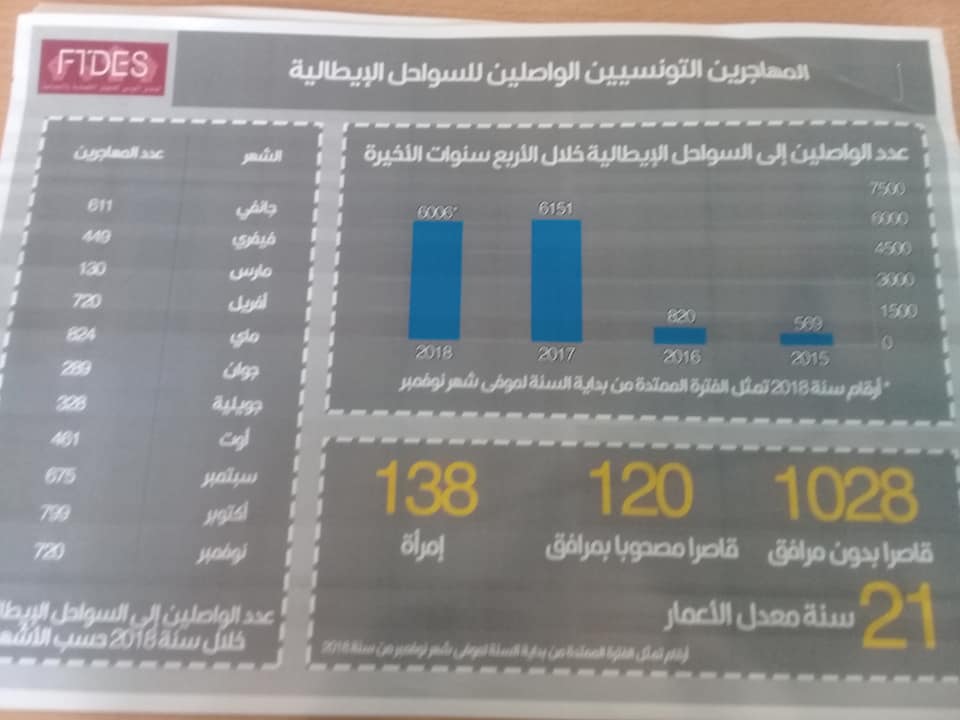 وقد بلغ عدد المهاجرين الذين تم إحباط محاولاتهم اجتياز الحدود البحرية سنة 2018 , 7046 مهاجر اما عدد المرحلين التونسيبن من ايطاليا فقد بلغ 2125 سنة 2017.