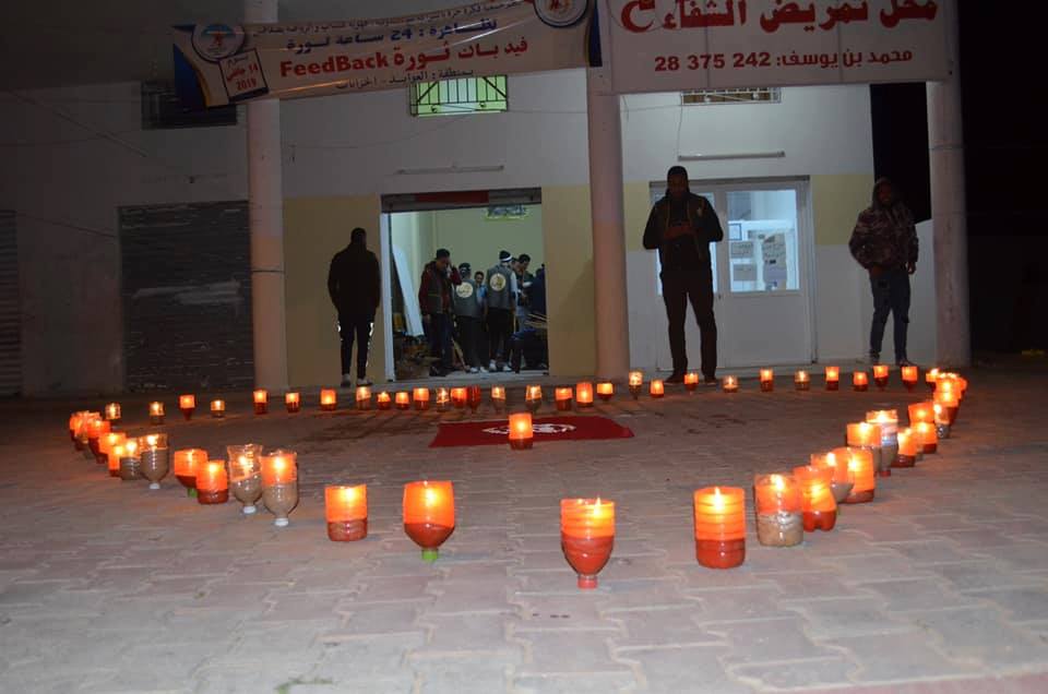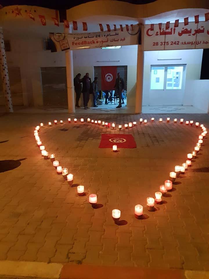 و انطلقت التظاهرة منتصف الليلة الماضية في شكل احتفالي من خلال التذكير بأهم لحظات الثورة بالاعتماد على الاشعار الموسيقى و الاناشيد الثورية... و انارة الشموع امام مقر الجمعية.