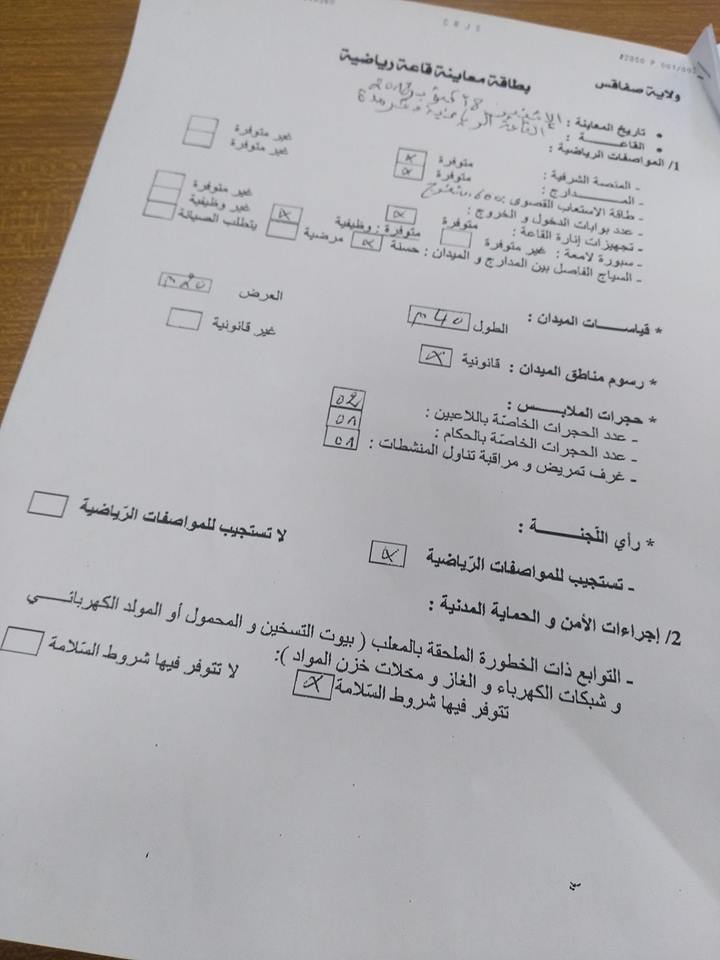 وتشمل عملية المعاينة المواصفات الرياضية المتعلقة بقياسات الميدان ورسوم مناطق الميدان كذلك حجرات الملابس إلى جانب إجراءات الأمن والحماية المدنية المتعلقة بالتوابع ذات الخطورة الملحقة بالقاعة والمتمثلة في بيوت التسخين والمولد الكهربائي و شبكات الكهرباء والغاز ومحلات خزن المواد.�