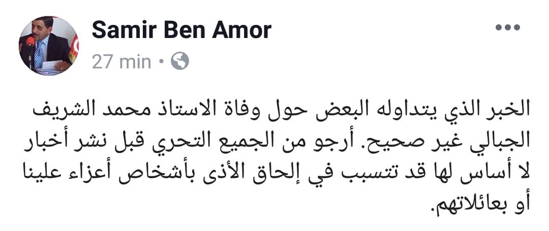 المحامي سمير بن عمر ينفي ما تم تداوله حول وفاة الأستاذ محمد الشريف الجبالي