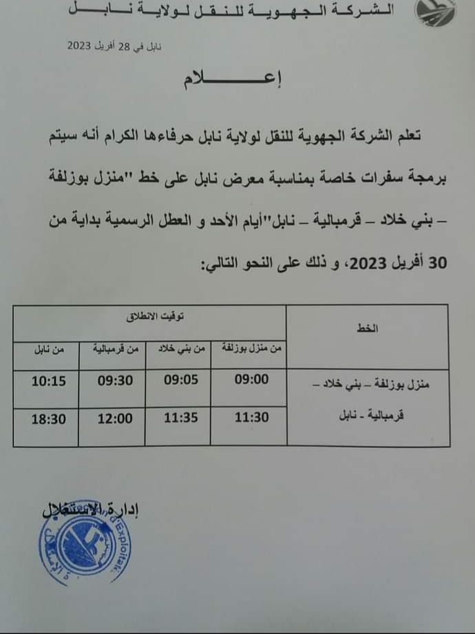 و في هذا الصدد، افادت الشركة الجهوية للنقل بنابل في بلاغ لمستعملي خط منزل بوزلفة _بني خلاد _ قرمبالية_نابل ،أنه بداية من يوم الاحد 30 أفريل 2023 ستشرع في تأمين سفرات خاصة بمناسبة معرض نابل أيام الأحد والعطل الرسمية .