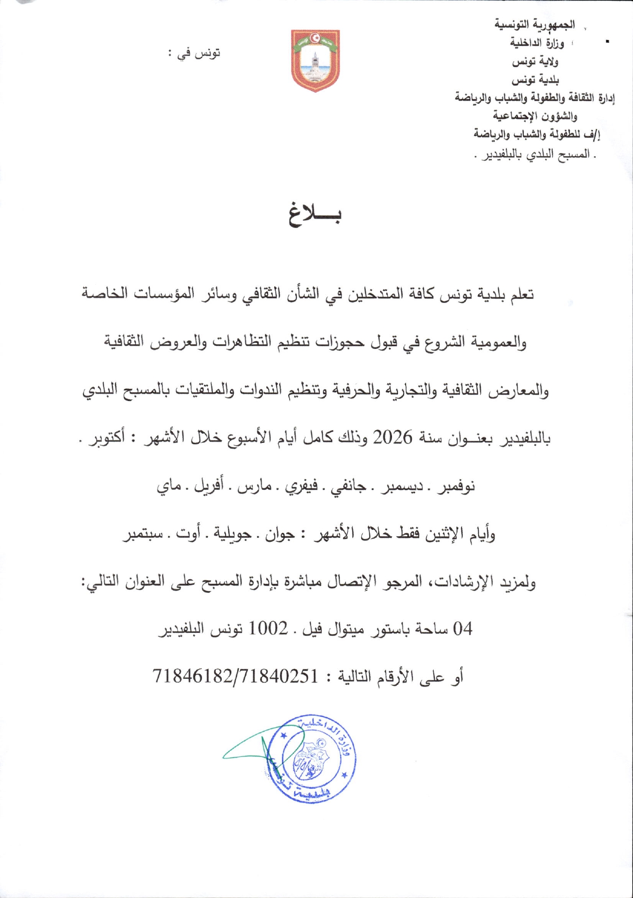 بلدية تونس تفتح باب حجوزات التظاهرات والمعارض الثقافية بمسبح البلفيدير لعام 2026