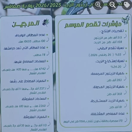 وفيما يخص الحركية الصناعية، سجلت الجهة تحويل 368 ألف طن من الزيتون، أسفرت عن استخراج 81 ألف طن من الزيت، بمتوسط نسبة استخراج تتراوح بين 20 و24 %. وتأتي هذه النتائج في ظل استمرار عمل 170 معصرة بالولاية، بطاقة تحويل يومية تقدر بـ 9566 طناً.