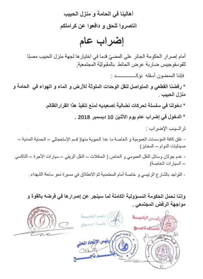 أعلنت اليوم عدد من المنظمات الوطنية بمنطقة منزل الحبيب من معتمدية الحامة من ولاية قابس عن الدخول في إضراب عام يوم الاثنين المقبل و الانطلاق في مسيرة نحو ساحة الشهداء على خلفية رفضهم القطعي والمتواصل لنقل الوحدات الملوثة للأرض والهواء والماء في الحامة ومنزل الحبيب