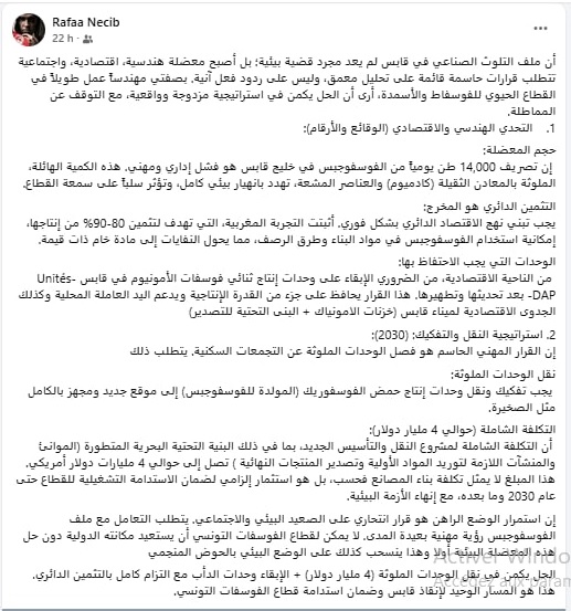 وشدّد على ضرورة تبني نهج الاقتصاد الدائري بشكل فوري عبر استخدام الفوسفوجبس في مواد البناء وطرق الرصف، مما يحول النفايات إلى مادة خام ذات قيمة مع الإبقاء على وحدات إنتاج ثنائي فوسفات الأمونيوم في قابس بعد تحديثها وتطهيرها.