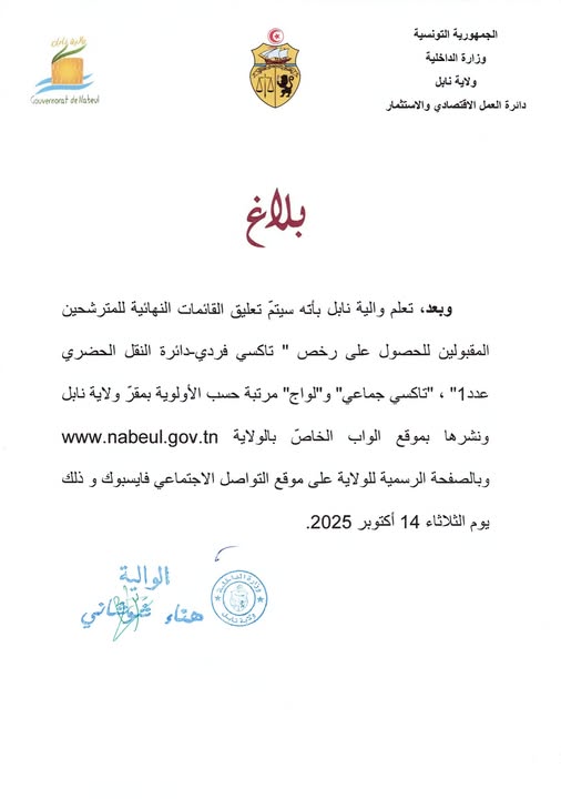 14 أكتوبر: الإعلان عن القائمات النهائية لمترشحي رخص التاكسي واللّواج بنابل