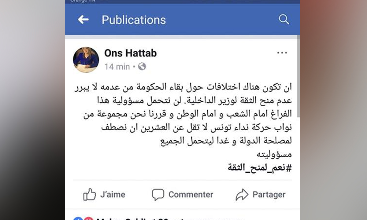 أكدت النائبة بمجلس نواب الشعب عن نداء تونس أنس حطاب في تدوينة على صفحتها بالفاسبوك أن مجموعة لا تقل عن 20 نائبا من نداء تونس قرروا أن يمنحوا الثقة لوزير الداخلية الجديد هشام الفراتي خلال جلسة التصويت المقررة ليوم غد السبت .