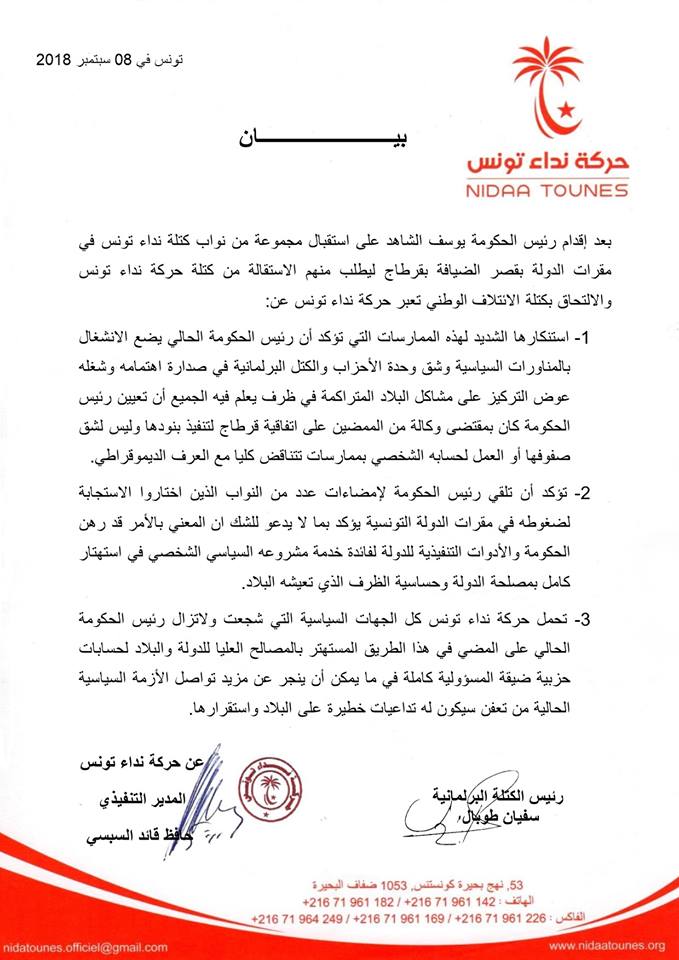 وأمضى البيان كل من رئيس الكتلة البرلمانية لحركة نداء تونس سفيان طوبال ومديرها التنفيذي حافظ قائد السبسي.