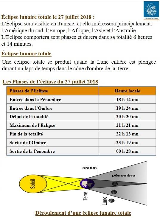 أصدر المعهد الوطني للرصد الجوي بلاغا أعلن من خلاله أن الأرض ستشهد خسوفا كليا للقمر يكون مرئيا في تونس وذلك يوم الجمعة 27 جويلية 2017 ويمكن مشاهدته بداية من الساعة السابعة مساء و 24 دقيقة إلى غاية الحادية عشر ليلا و19 دقيقة.