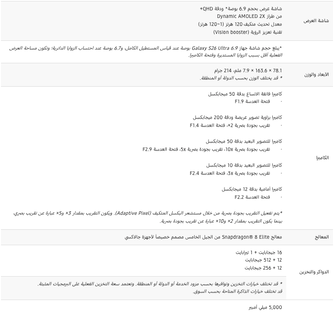 [3] تم عرض تحسينات أداء المعالج بالمقارنة مع جهاز Galaxy S25 Ultra. ويعتمد الأداء الفعلي على بيئة المستخدم وظروف الاستخدام والتطبيقات والبرامج المثبتة مسبقاً.