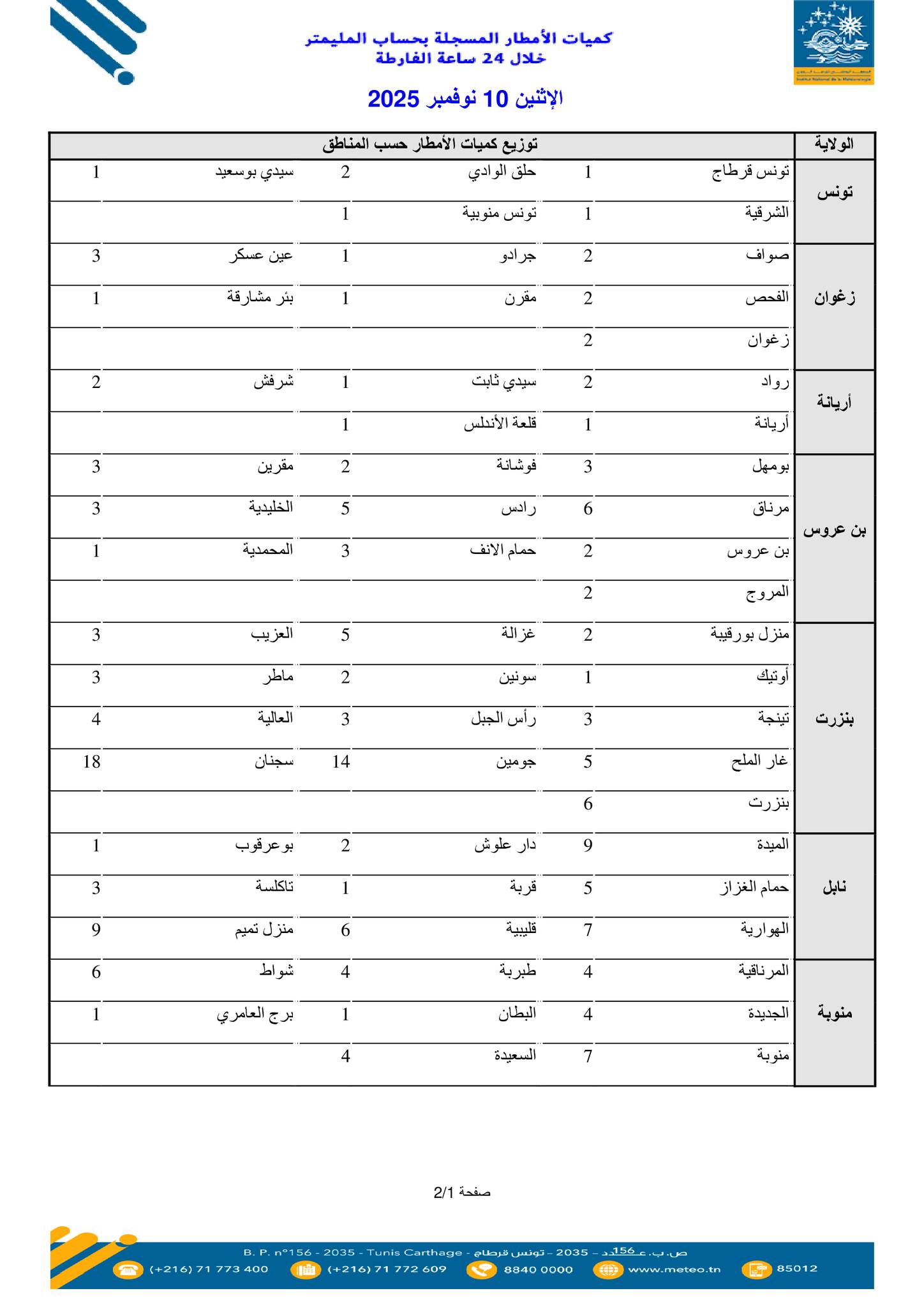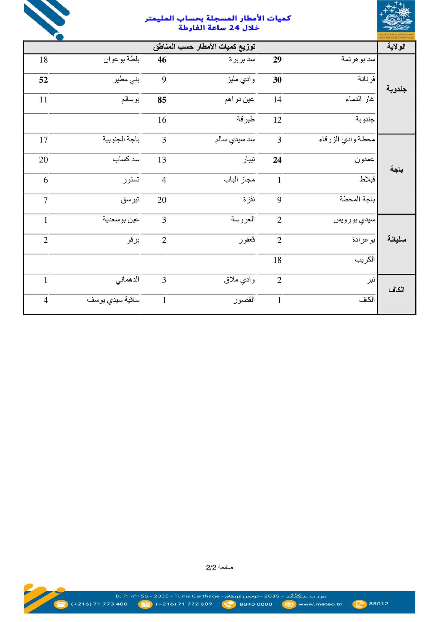 وفيما يلي قائمة لكميات الأمطار المسجلة بحساب المليمتر: