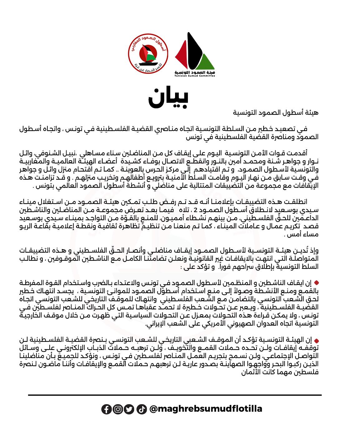 وشدّدت الهيئة على أن ''هذه الإجراءات تمثل انتهاكًا لحق الشعب التونسي في التضامن مع الشعب الفلسطيني، واصفةً ما يحدث بأنه تحول خطير قد يؤثر على جميع الأنشطة المناصرة لفلسطين في تونس، كما ربطت البيان بالتحولات السياسية الأخيرة لموقف تونس تجاه العدوان الصهيوني والأمريكي على إيران''.