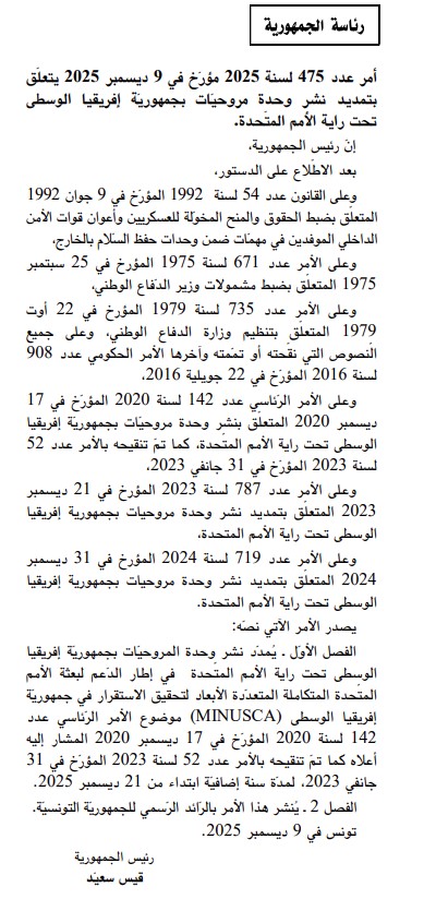 وينص الأمر عدد 475 لسنة 2025، المؤرخ في 9 ديسمبر 2025، على أن هذا التمديد يسري مفعوله ابتداءً من 21 ديسمبر 2025، وذلك في إطار مواصلة الدعم لبعثة الأمم المتحدة المتكاملة المتعددة الأبعاد لتحقيق الاستقرار في جمهورية إفريقيا الوسطى (مينوسكا).