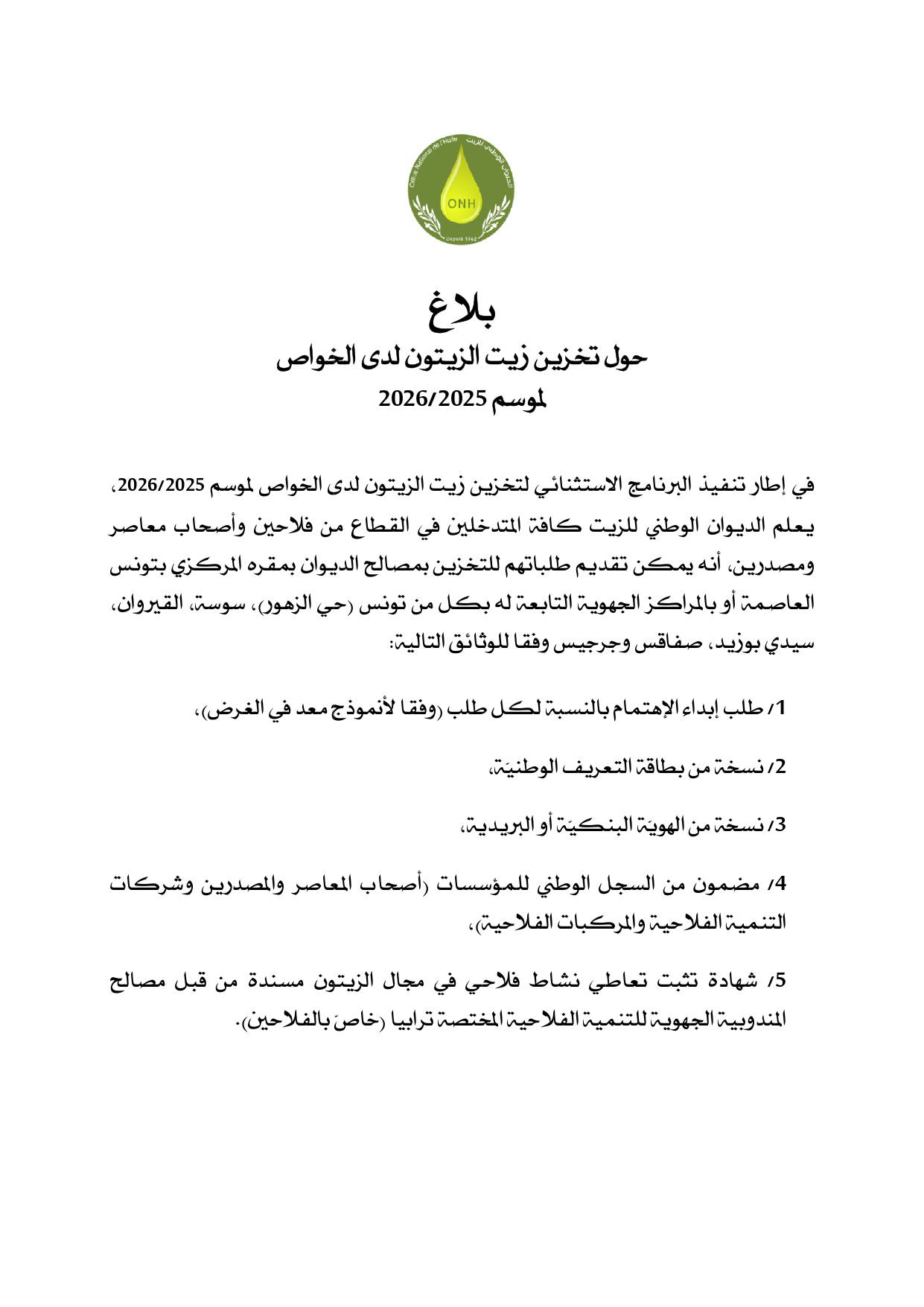 ويهدف القرار إلى تجسيد توصيات المجلس الوزاري المضيّق المنعقد يوم 25 أكتوبر 2025، والمتعلقة بالاستعداد لموسم زيت الزيتون 2025/2026، والتي نصّت على تكليف الديوان الوطني للزيت بتنفيذ برنامج لتخزين ما بين 100 و150 ألف طن من زيت الزيتون لفترة محددة بثلاثة أشهر، مع إقرار منحة خزن ومنحة إضافية لفائدة الفلاحين.