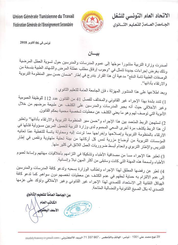 دعت الجامعة العامة للتعليم الثانوي المدرسين والمدرسات إلى عدم الالتزام بمنشور وزارة التربية حول تسوية العطل المرضية حيث يستوجب إرفاق مطلب عطلة المرض والشهائد الطبية بنسخة من الوصفات الطبية تامة الدفع معبرة عن رفضها المطلق لهذا المنشور ومطالبة الوزارة بسحبه.