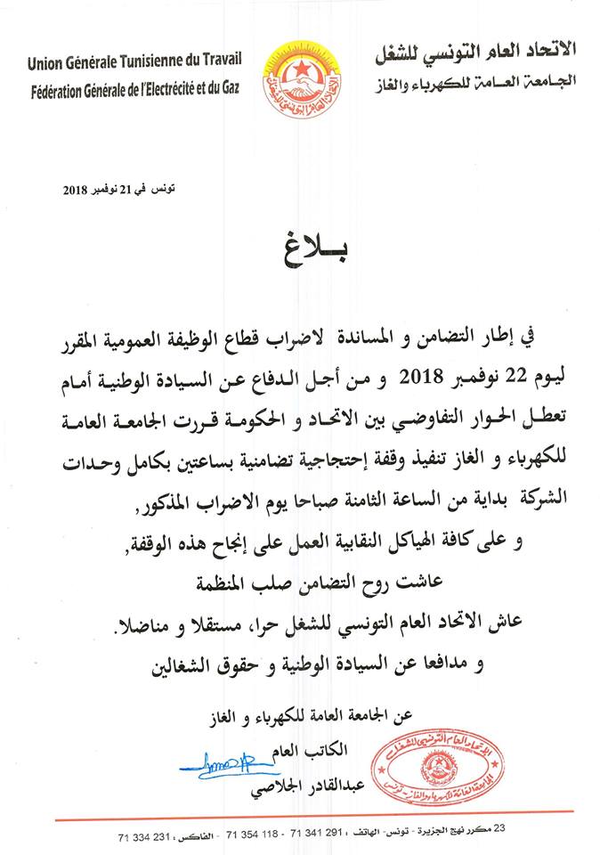 قررت الجامعة العامة للكهرباء و الغاز تنفيذ وقفة احتجاجية بساعتين بكامل وحدات الشركة التونسية للكهرباء والغاز غدا الخميس بداية من الساعة الثامنة صباحا.