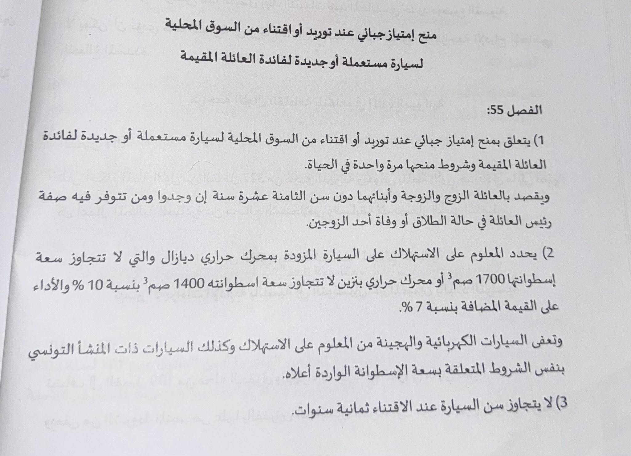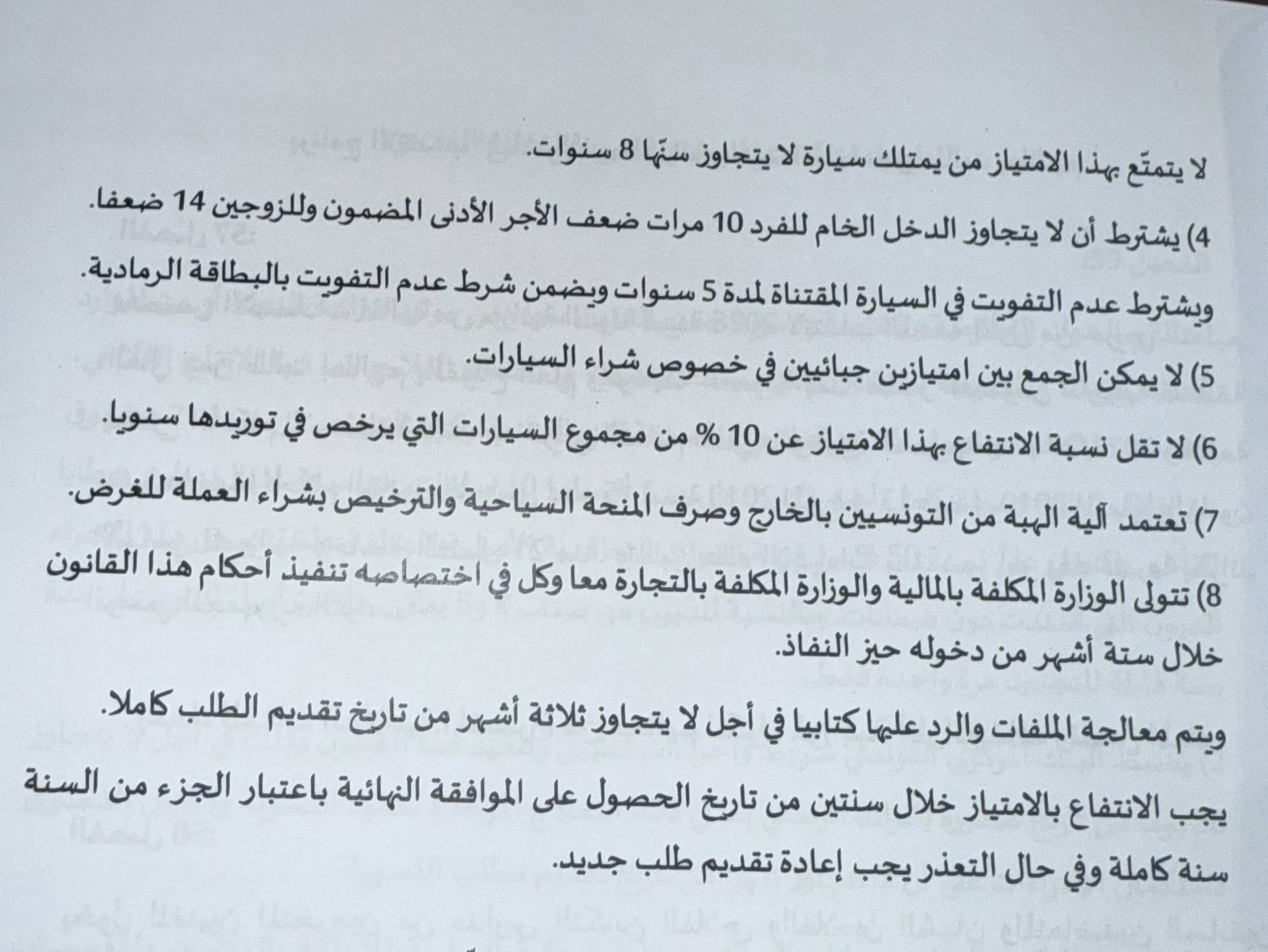 وأثار مقترح القانون جدلا داخل قبة البرلمان بين النواب و وزيرة المالية مشكاة سلامة الخالدي، التي قالت بخصوص المقترح إنها — كمواطنة — لا تعارض فكرة توريد سيارة من الخارج في حال وفّرت الدولة الإطار القانوني اللازم. غير أنها شددت على أن المشرّع التونسي لم يمنح المواطن هذا الحق، نظراً لكون عملية التوريد تخضع لشروط وضوابط واضحة ومحدّدة.