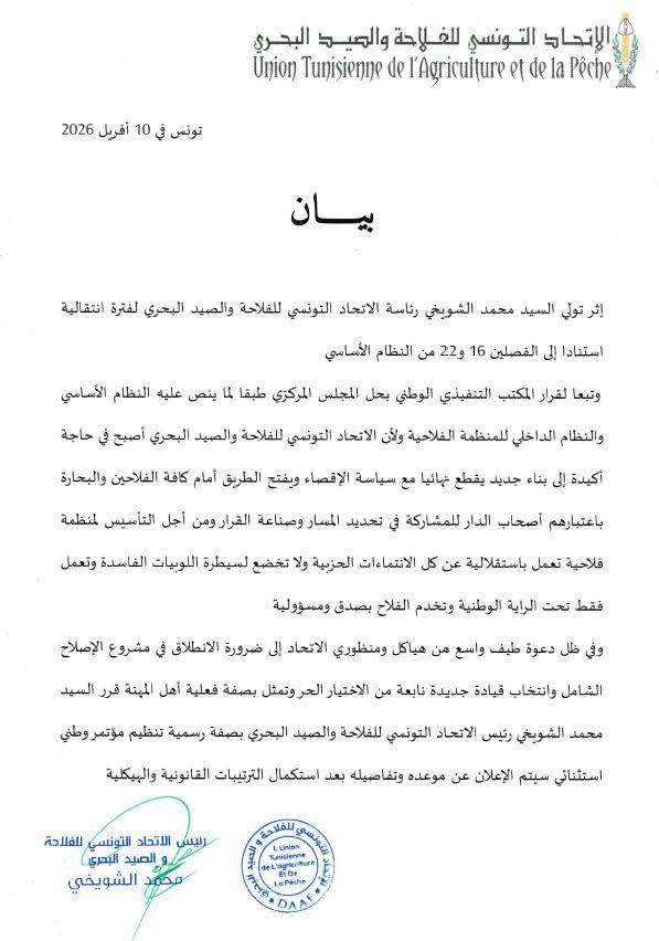 وقال البيان ان ذلك يأتي من أجل التأسيس لمنظمة فلاحية تعمل باستقلالية عن كل الانتماءات الحزبية ولا تخضع لسيطرة اللوبيات الفاسدة و تعمل فقط تحت الراية الوطنية وتخدم الفلاح بصدق و مسؤولية.