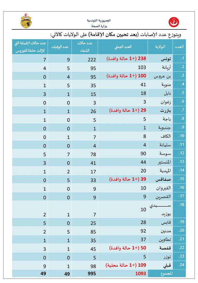 وأصبح بذلك العدد الجملي للمصابين بهذا الفيروس، وذلك بعد التثبت من المعطيات وتحيينها، 1093 حالة مؤكدة موزعة كالآتي: 995 حالة شفاء و49 حالة وفاة (لم يتم تسجيل حالات وفاة جديدة) و49 حالة إصابة لا تزال حاملة للفيروس وهي بصدد المتابعة.