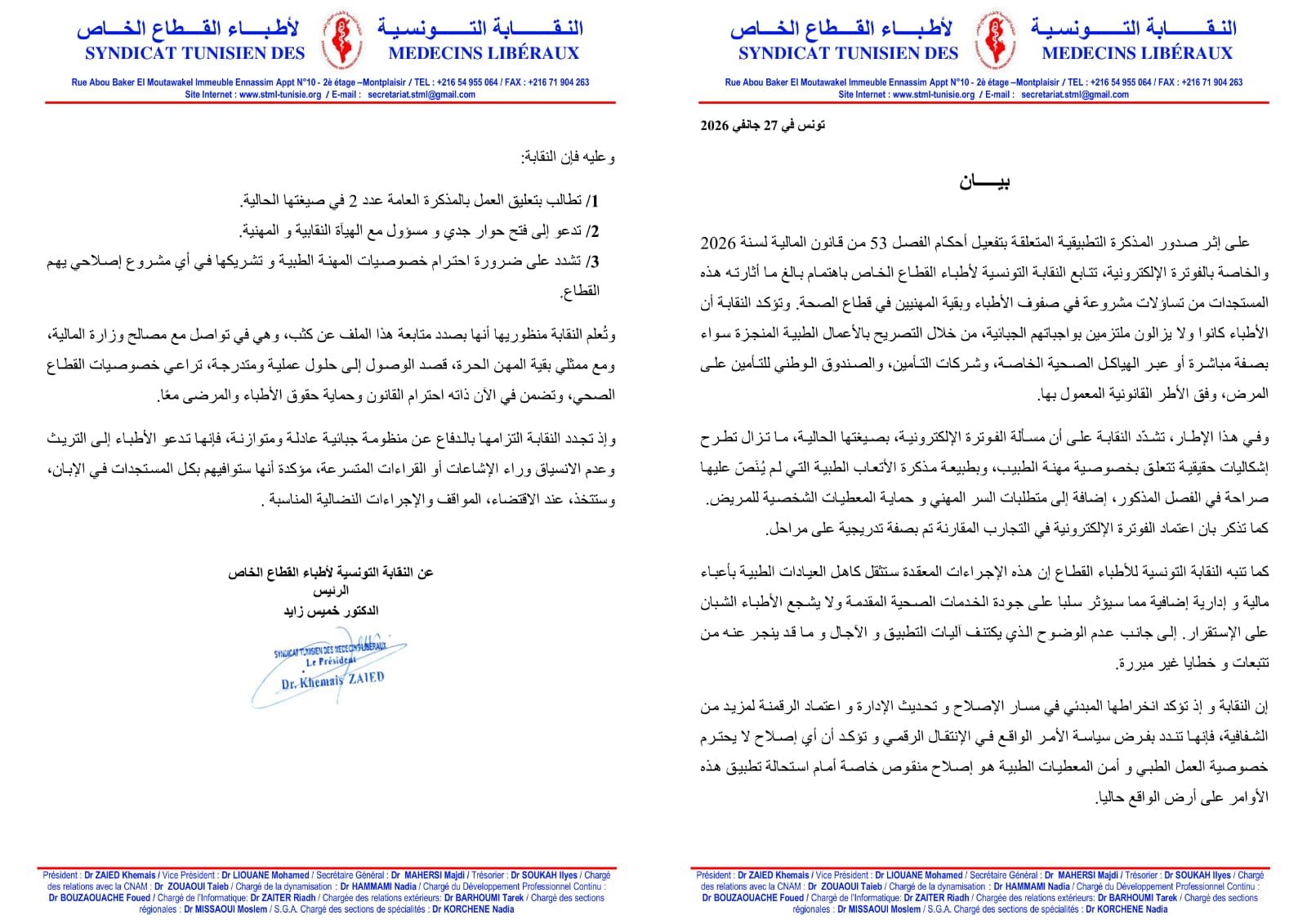 وأكدت النقابة أن مسألة الفوترة الإلكترونية بصيغتها الحالية، ما تزال تطرح إشكاليات حقيقية تتعلق بخصوصية مهنة الطبيب، وبطبيعة مذكرة الأتعاب الطبية التي لم يُنَصّ عليها صراحة الفصل 53 من قانون المالية لسنة 2026 الخاص بالفوترة الإلكترونية، إضافة إلى متطلبات السر المهني و حماية المعطيات الشخصية للمريض