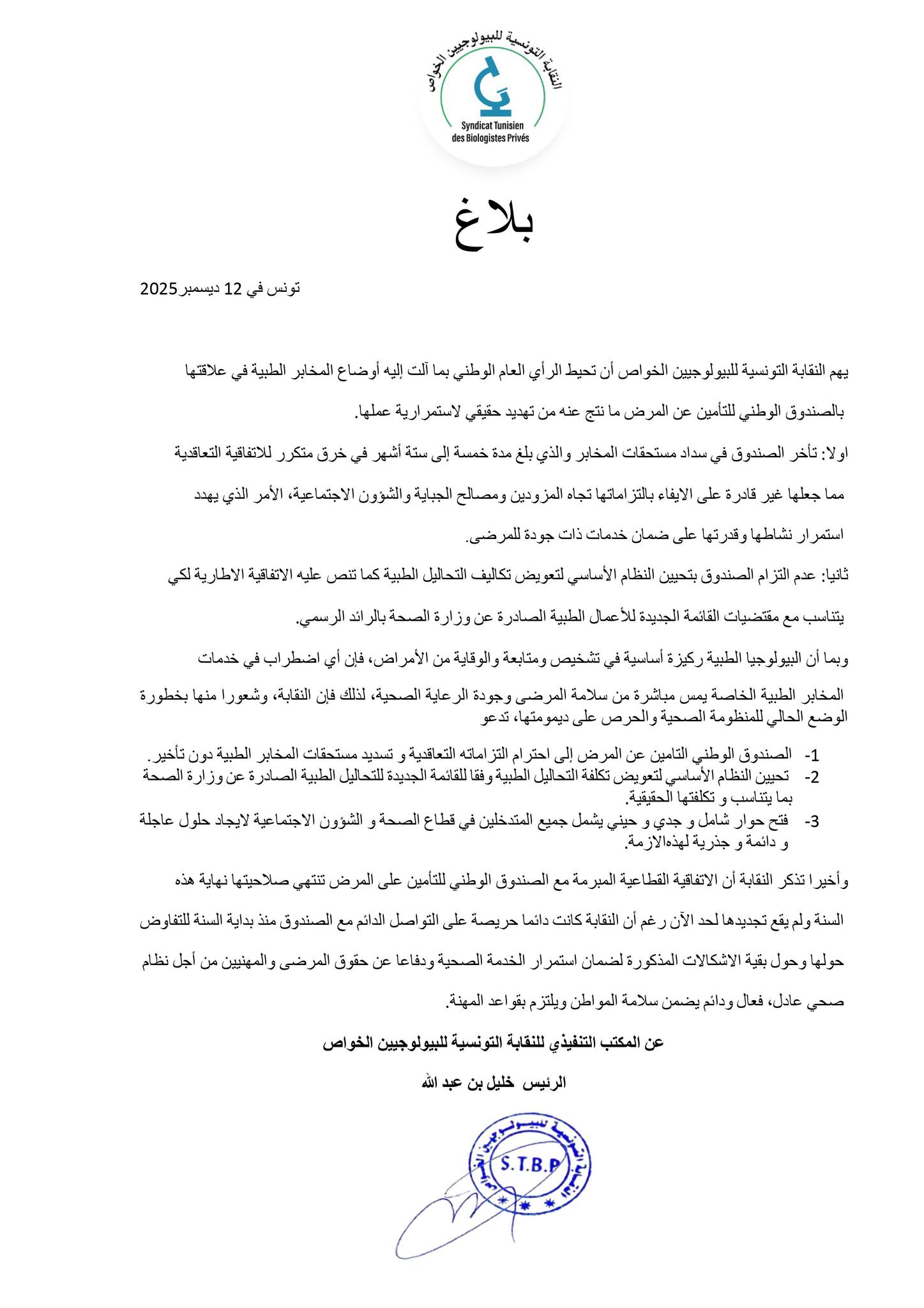 وانتقدت النقابة عدم التزام “الكنام” بتحيين نظام تعويض التحاليل الطبية وفق القائمة الجديدة للأعمال الطبية، داعية إلى مراجعة هذا النظام بما يعكس التكلفة الحقيقية للتحاليل، وإلى فتح حوار عاجل مع جميع المتدخلين لإيجاد حلول جدّية ودائمة.