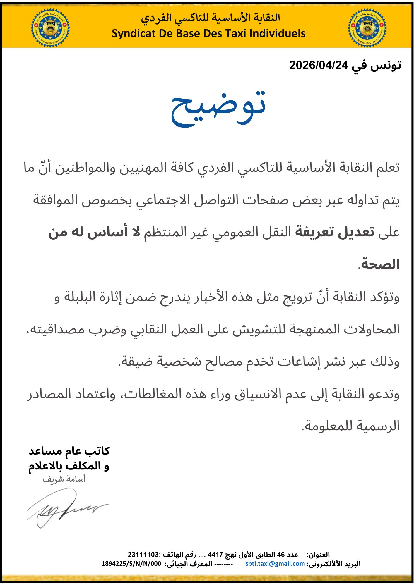 وأكدت النقابة في بلاغ لها أن هذه المعلومات لا أساس لها من الصحة، معتبرة أن ترويجها يهدف إلى إثارة البلبلة والتشويش على العمل النقابي، إضافة إلى المسّ من مصداقيته عبر نشر إشاعات تخدم، وفق تعبيرها، مصالح شخصية ضيقة.