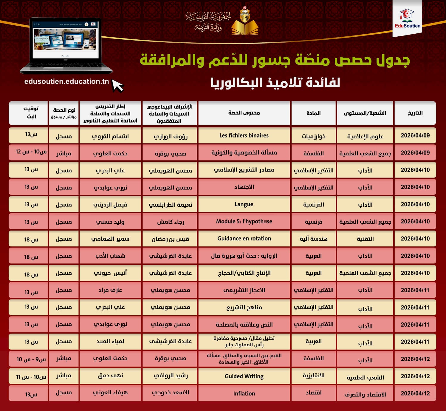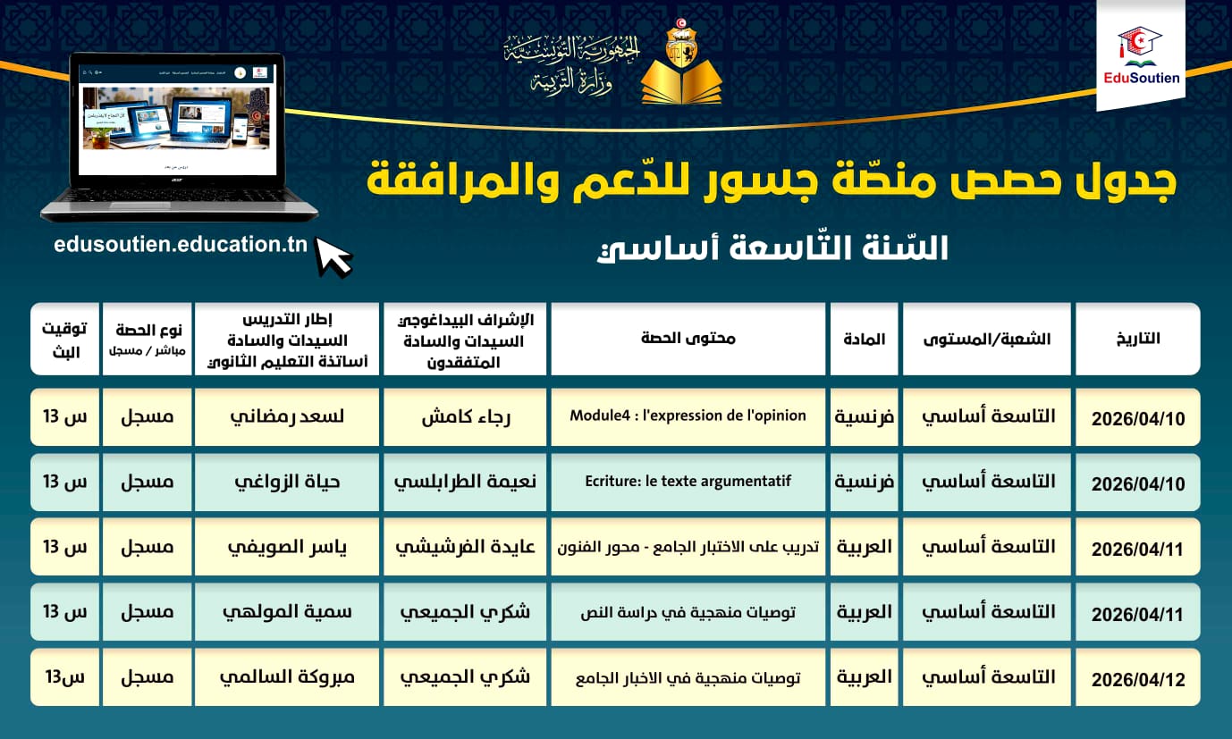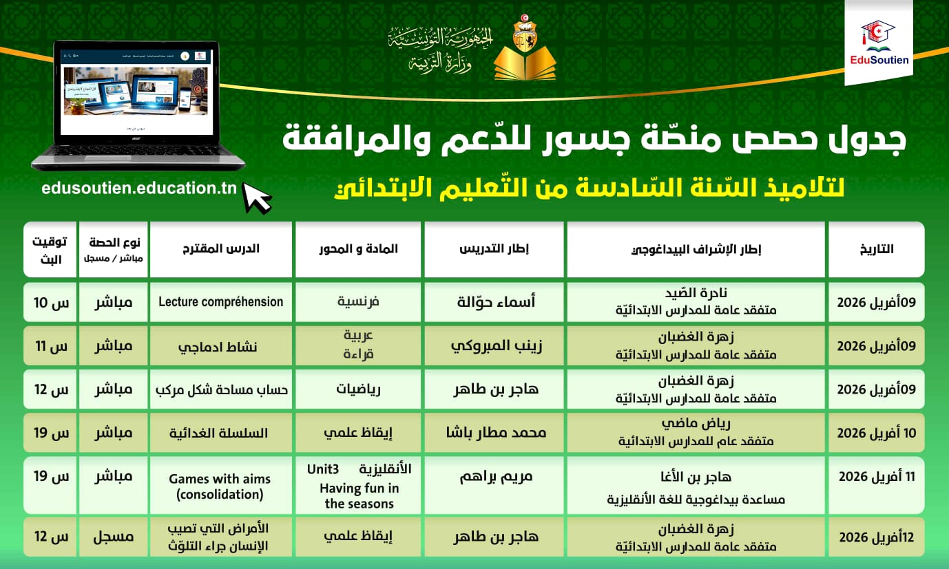 وتؤمّن هذه الحصص نخبة من المتفقدين والأساتذة المختصين، بما يوفّر محتوى منهجيًا وتطبيقيًا يساعد التلاميذ على تثبيت المعارف وتحسين أدائهم الدراسي.