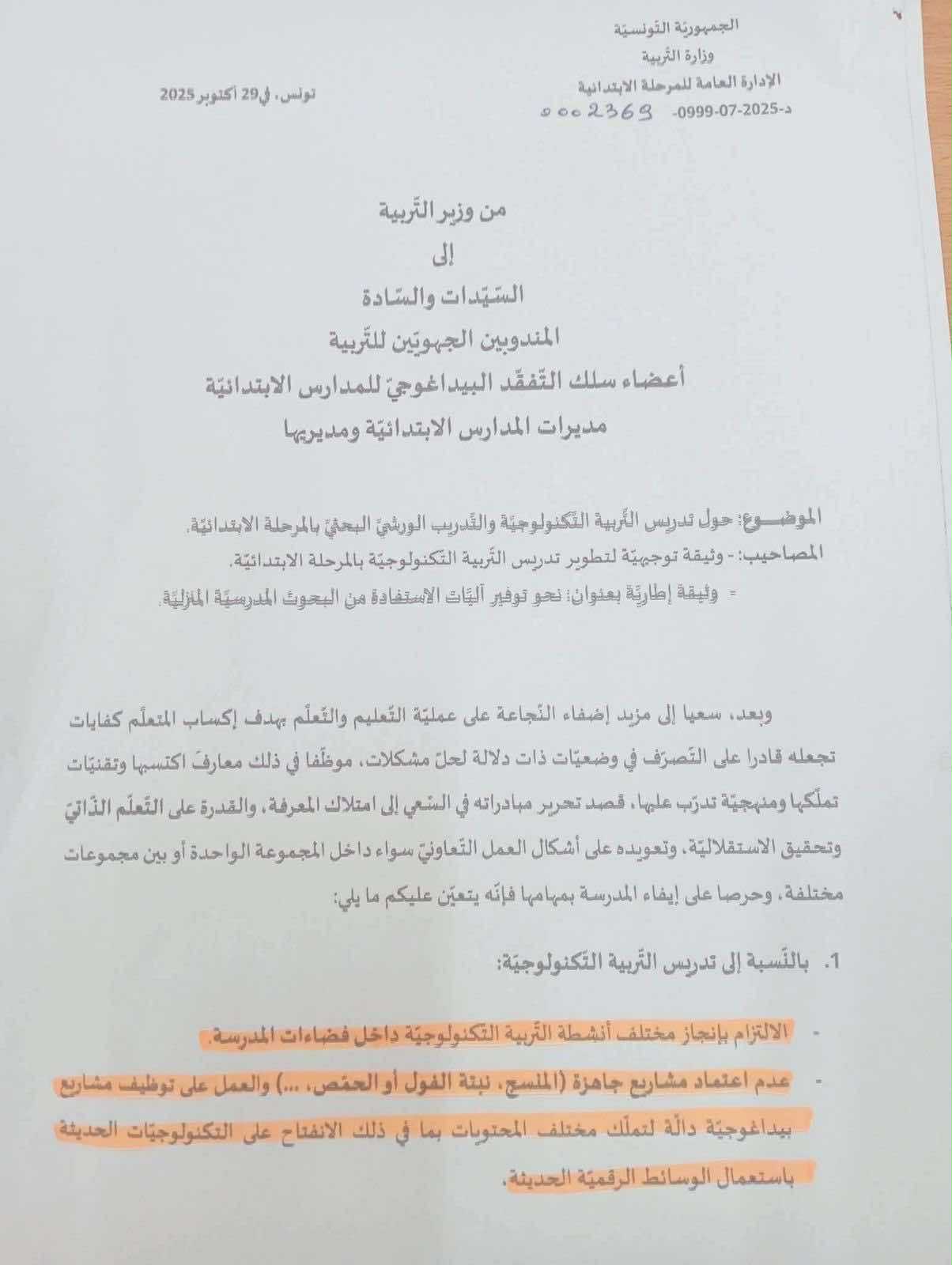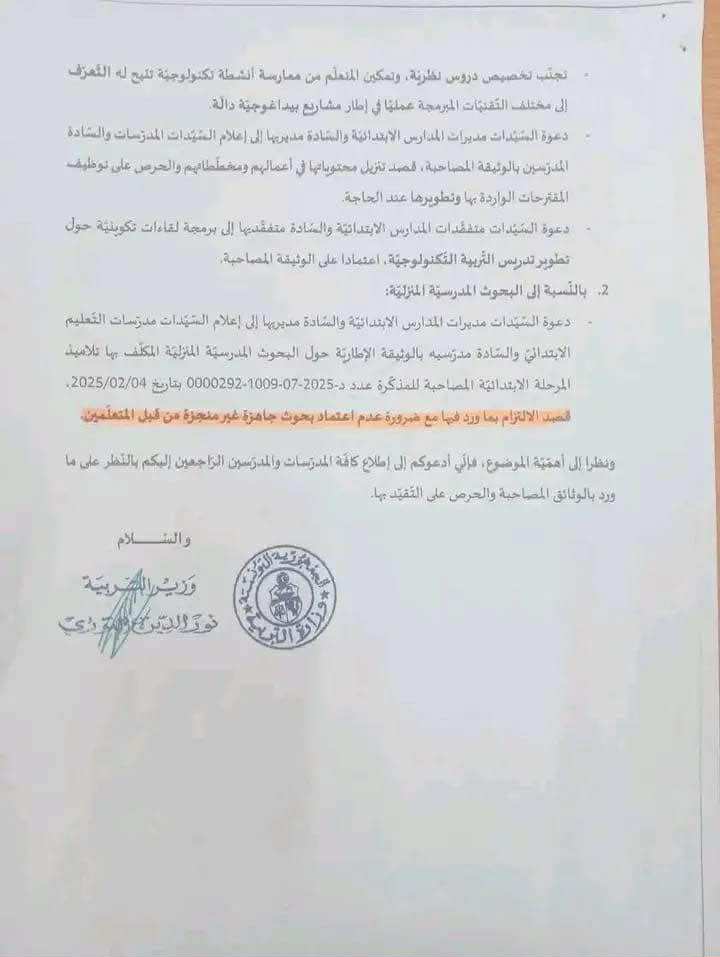 و اضافت الوزارة أن ذلك يأتي سعياً إلى مزيد اضفاء النجاعة على عملية التعليم والتعلّم بهدف إكساب المتعلم كفايات تجعله قادراً على التصرّف في وضعيّات ذات دلالة لحلّ مشكلات، موظّفاً في ذلك معارف اكتسبها وتقنيات تملكها ومنهجية تدرّب عليها، قصد تحرير مبادراته في السعي إلى امتلاك المعرفة، والقدرة على التعلّم الذاتي وتحقيق الاستقلالية، وتعويده على أشكال العمل التعاوني سواء داخل المجموعة الواحدة أو بين مجموعات مختلفة، وحرصاً على إيفاء المدرسة بمهامها.